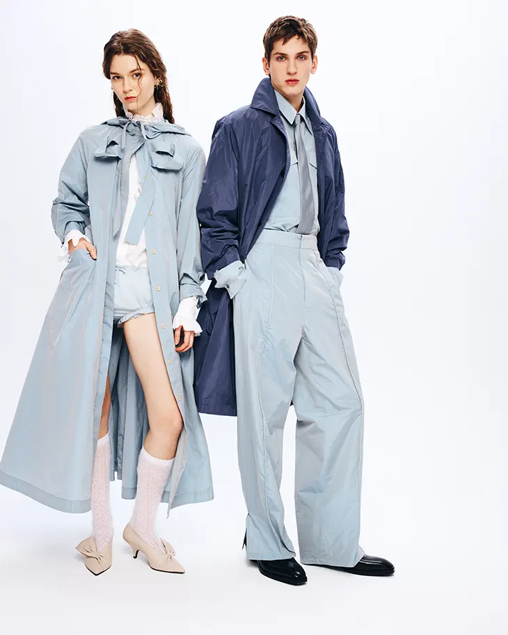 Powdery greys, forest greens, lunar blues, aubergine purples, and lilac tones set a restrained mood, while touches of sky blue sharpen contrast. Iconic bows and the brand’s celebrated collars evolve into flat, architectural forms. Designers apply these elements to shirts, coats, dusters, and a sharply tailored women’s tuxedo that projects authority and attitude.