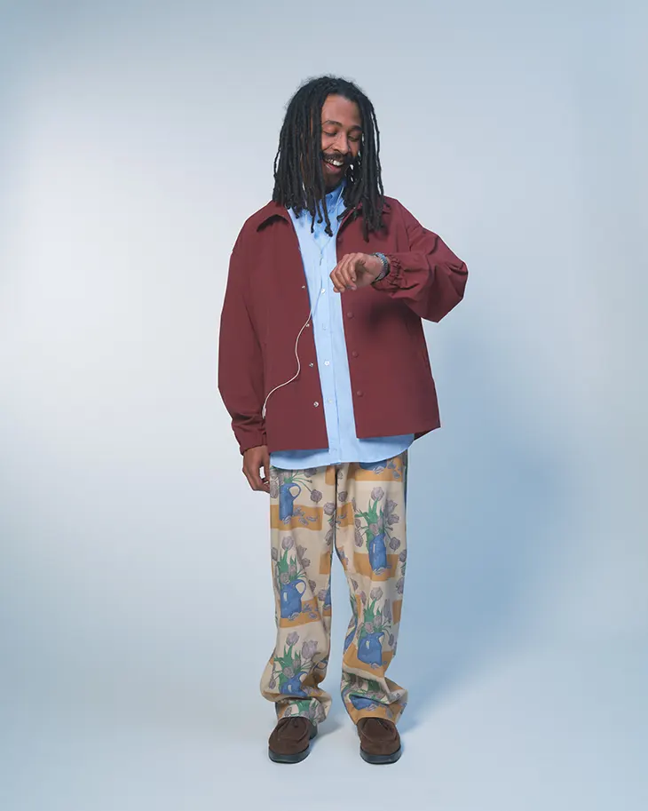Familiar from past Vowels collections, Yagi introduces a range of whimsical motifs worked into the apparel through a variety of fabrication techniques. A rural exterior scene. Tulips painted by Dutch artist Frans Everbag. Alpine skiers. These references arrive not as novelty prints but as considered design elements, integrated with the same intentionality that defines the brand’s approach to construction.