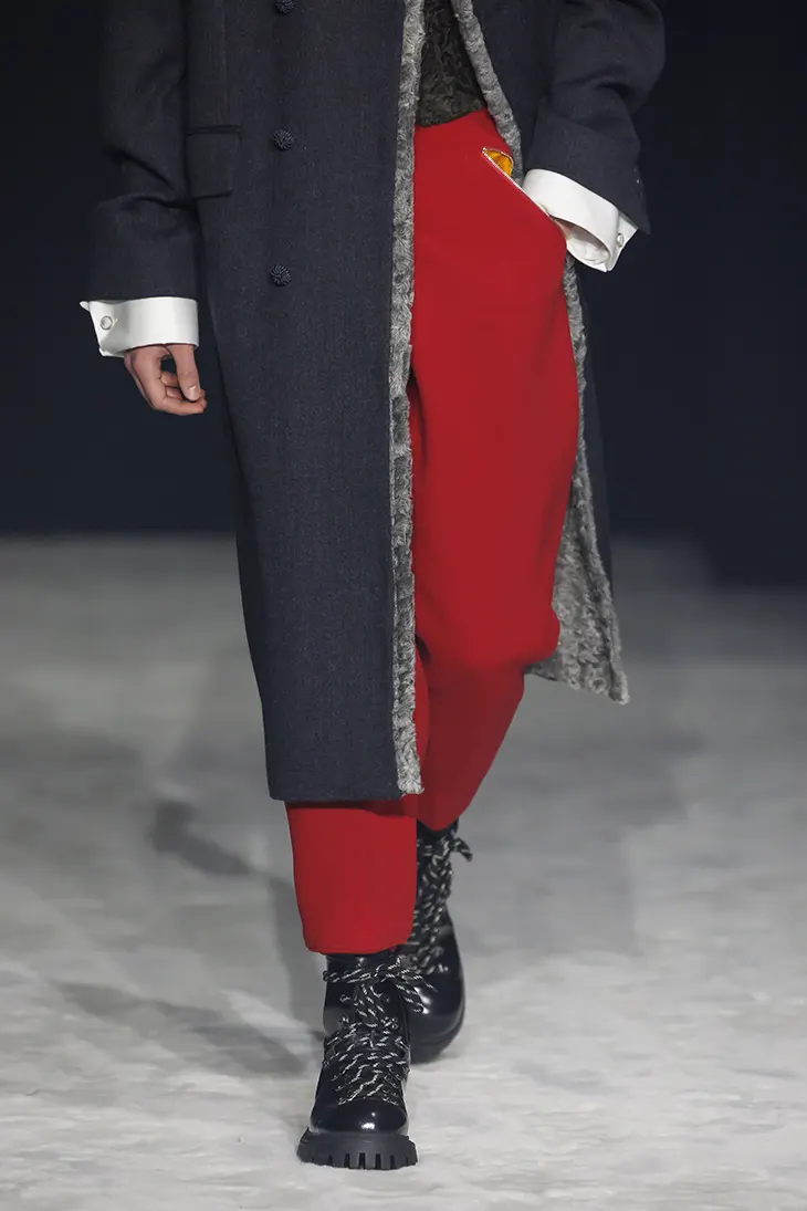 The tension between refined and elemental runs through every garment. Voluminous knitted and faux fur beanies, equestrian trousers with buttoned ankle cuffs, old-world woollen snow breeches, and shearling-lined jeans inject a nomadic sensibility with streetwear energy. Raincoats, padded and quilted sports jackets with matching trousers evoke the glamour of techno-wear, riffing on protective elegance for the modern commuter.