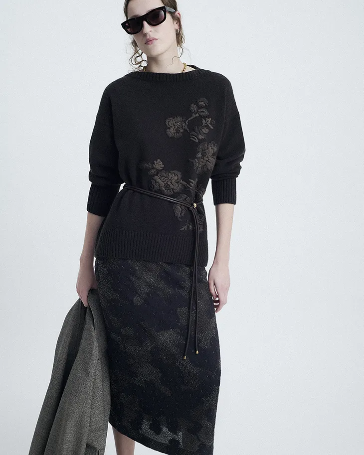 Saturated hues such as dark ebony, teal blue, ivory, and winter pastels define fluid silhouettes and relaxed proportions. Tailoring in mouliné wool introduces structured coats and jackets, while lightweight cashmere Double creates enveloping outerwear. Nappa leather jackets feature hand-stitched detailing that emphasizes craftsmanship. Floral motifs appear in altered and abstract forms, printed across airy dresses and blouses, integrated into knitwear through intarsia, and translated into micro-beaded jacquards. These details create surfaces shaped through texture and layered visual depth.
