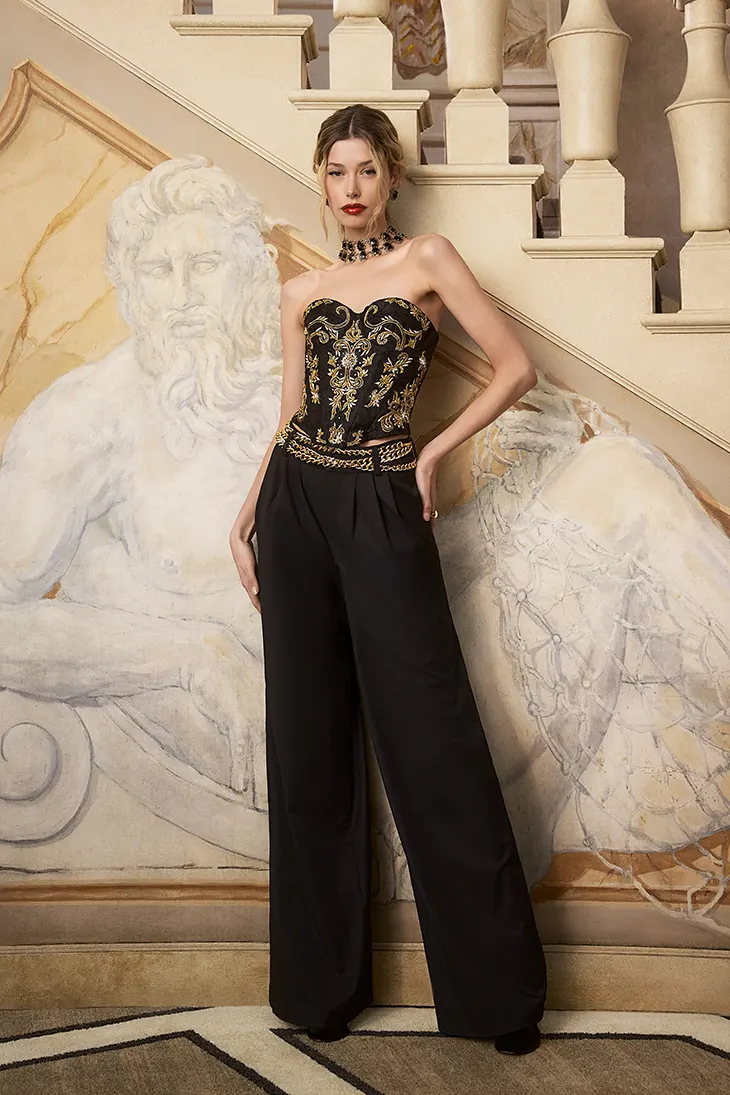 A glam-rock undercurrent runs through the palette of black, ivory, silver, gold, and burgundy. Shine and structure work in tandem. Crystal corsets, velvet bustiers, and a chain-mail beaded camisole revive the ritual of the going-out top. Bendet revisits that early-2000s instinct: find the statement piece, pair it with jeans, and claim the night. She renders each top as an object of desire, engineered to deliver impact with ease.