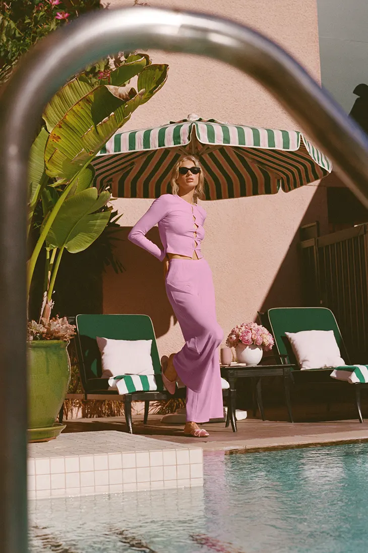 Shot at the Beverly Hills Hotel, the campaign places Hosk in settings that feel relaxed and personal. She moves through the space wearing soft, cozy silhouettes suited for a quiet date night at home, then steps outside in lighter, playful looks intended for a morning walk.