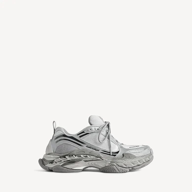 Balenciaga updates key coded elements from the permanent line. A 3B Sport emblem appears at the top edge of the toe alongside the Balenciaga logo. Divergent graphics appear debossed along the sides. On the back of each heel, near the printed shoe size, the brand retains a signature detail established with the first Triple S. Bicolor laces return, crossing over a tongue stamped with a new Triple S.2 emblem. These references connect the new iteration to its origin while defining a distinct identity.