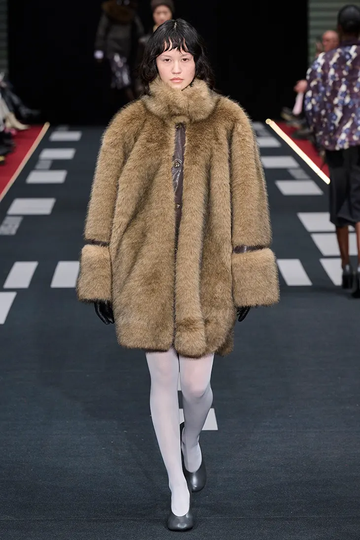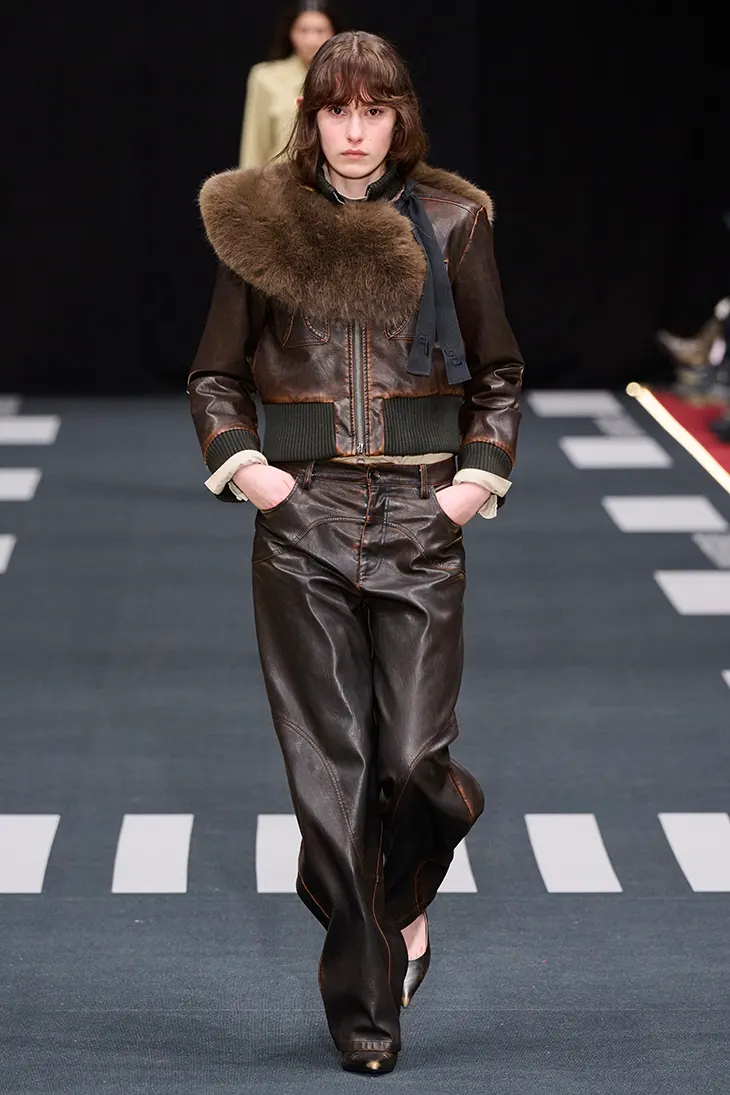 Aviator jackets, uniform shirts, distressed leather, and rigid denim establish the structural base of the collection. Outerwear anchors the season, with puffed jackets, structured coats, and oversized aviator silhouettes forming its core. These pieces suggest protection and resilience, echoing the demands of early flight.