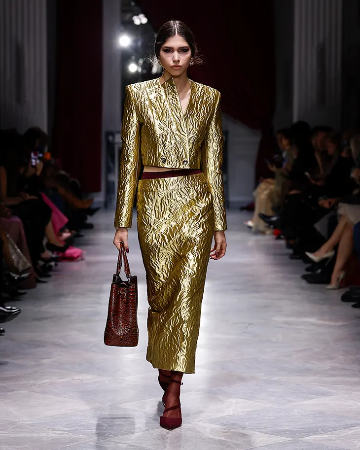 For the third consecutive season, Mohapatra collaborated with Tanishq USA. The jewelry aligned with the collection’s focus on balance, strength, and detailed artistry. Pieces complemented the garments through proportion and finish. Mohapatra also partnered with Janavi India, whose cashmere scarves added warmth and tactile depth to select looks. Guests received curated tea gift boxes from Gardens of India Tea, a gesture that referenced India’s tea tradition. For Fall 2026, Bibhu Mohapatra draws on the legacy of the Brahmavadinī to shape garments defined by structure and composure.