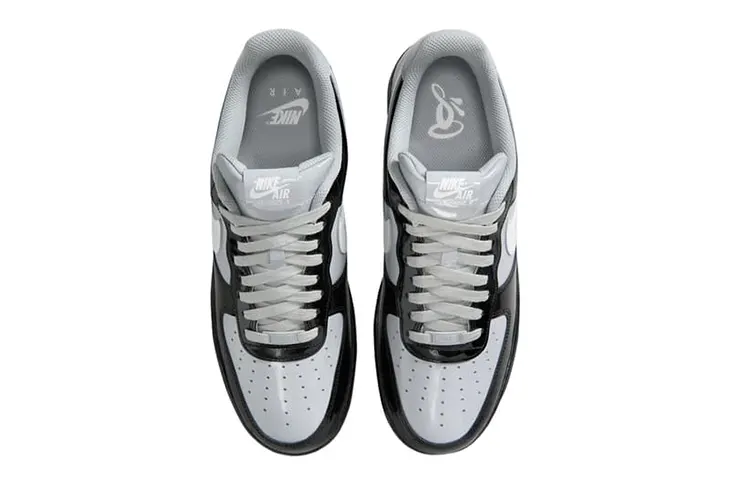 A third colorway, “Light Smoke Grey,” introduces a quieter approach. Inspired by the tones of classic Nike Tech Fleece tracksuits, the upper combines soft grey leather panels with a glossy black patent leather mudguard. A white Swoosh cuts through the muted base, while SYNA WORLD branding on the heel signals the collaboration without dominating the design. The finish reflects the ongoing return of Y2K textures within Air Force 1 releases, balancing gloss with everyday wearability.