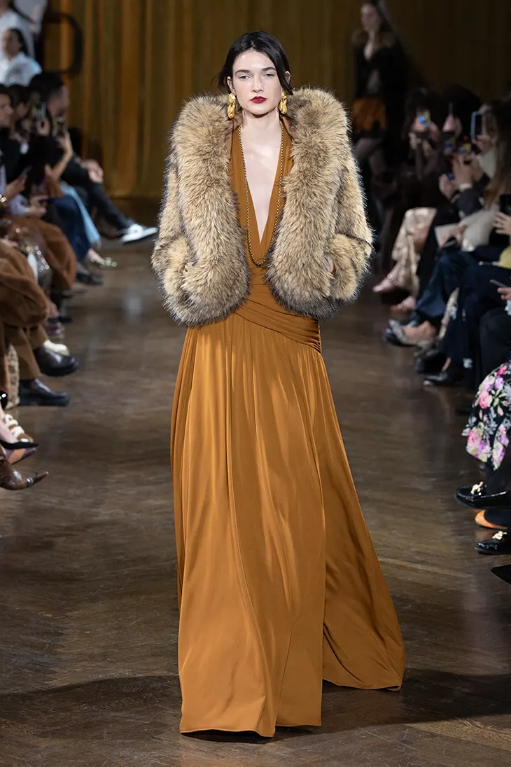 Cascading ruffles and pussy-bow blouses appear alongside sheer silhouettes and skin-baring necklines. Gilded embroidery and raised hemlines create a balance between traditional styles and provocation. The brand utilizes silk trimmed in lace, regal gold brocade, and lush florals to update familiar silhouettes. Plush faux furs add texture to the garments throughout the show. The color palette relies on ochre, deep burgundy, olive green, and ivory. Bursts of poppy red and saturated blue punctuate these grounded tones.