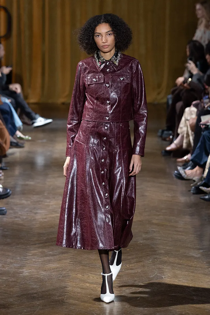 The runway presentation translates the energy of the 1970s into a contemporary context by mixing delicate lace with rugged vegan leather. This collection, La Célébration, honors the history of Cinq à Sept by referencing the decades that influence the brand’s direction.