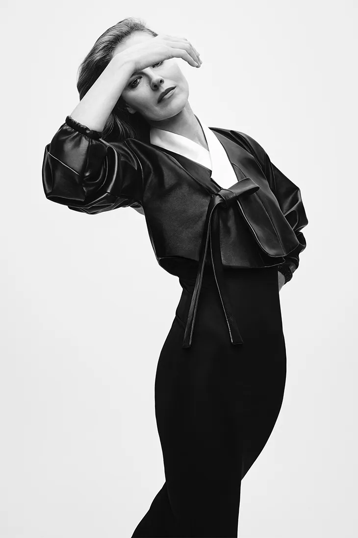 Material choices define the collection’s tactile language. Silk jersey, organza, lace, and velvet interact with supple leathers and polished finishes. These combinations create contrast between matte and sheen, heaviness and lightness. The color range remains limited. Black and white anchor the collection, joined by a graphic black-and-white print inspired by stone formations. Sand tones and muted gold appear as accents, drawn from natural light and softened surfaces.