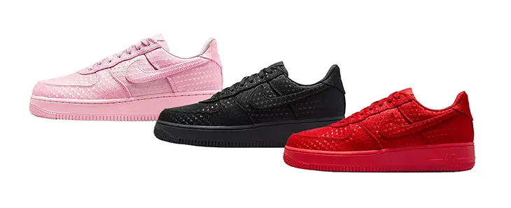 Nike explores diverse emotional registers through three contrasting iterations of the Air Force 1 silhouette. Available in Triple Black, University Red, and a soft Pink edition, these sneakers anchor seasonal details within a familiar, high-grade tumbled leather structure. While the Triple Black pair offers a restrained, tonal look, the Red and Pink versions use the same rhythmic motif to create a more vibrant surface. Each pair features a detachable silver or gunmetal jewelry charm and a concealed “Love Is In The Air” inscription beneath the tongue, prioritizing intimate details and personal choice for the wearer.