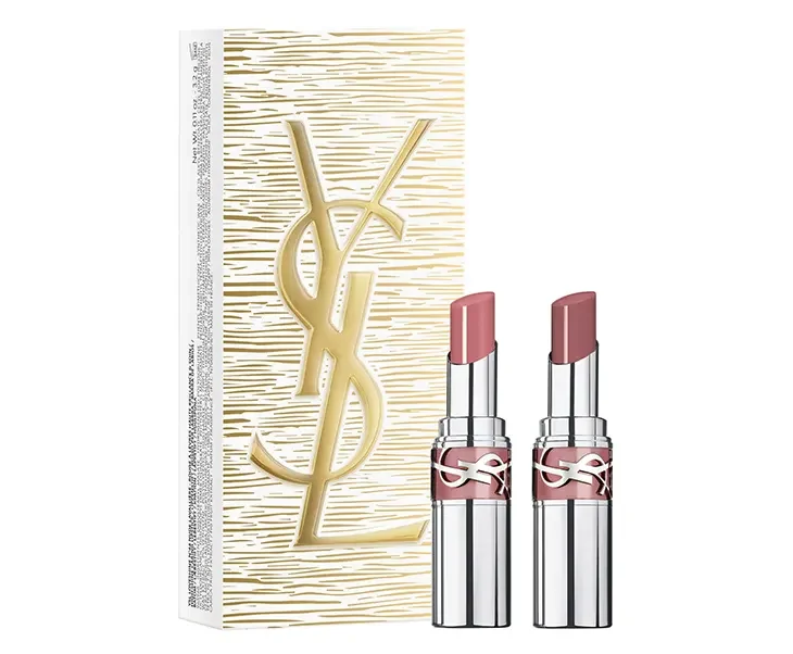 YSL Beauty merges high-performance skincare with refined color through the Loveshine Lip Oil Stick Duo. This set includes two bestselling pink shades: 44 Nude Lavalliere and 213 Pink Trip, housed in sleek silver packaging. The formula utilizes a 60% oil base enriched with fig pulp and six nourishing oils to provide up to 24 hours of hydration and protection. By functioning as a hybrid between a lipstick and a treatment, these sticks melt onto the lips to provide a creamy shine while improving texture and softness over time.