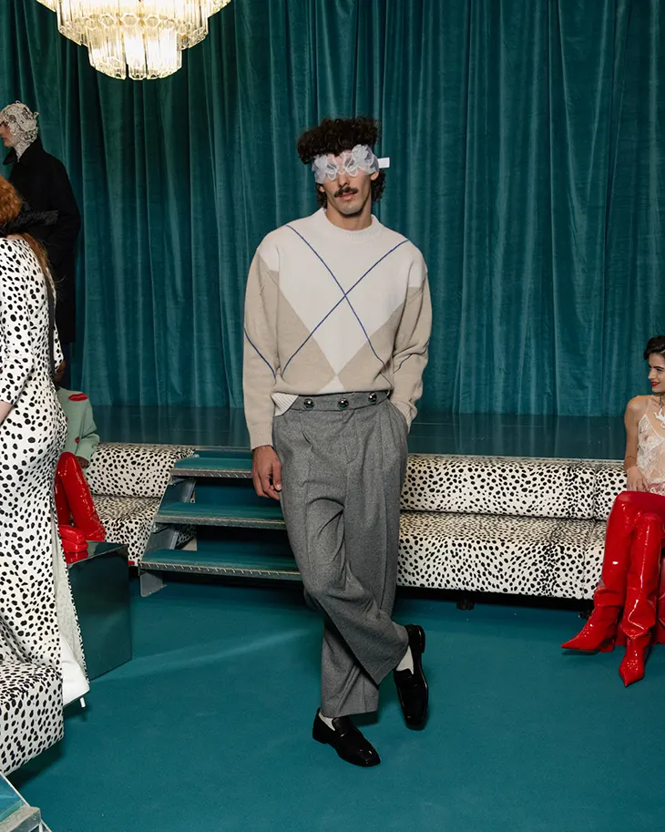 Menswear maintains this dynamic through texture and geometry. Soft mohair and wool knitwear engage tailored garments with measured contrast. Argyle emerges as a fragmented motif, flickering across surfaces and interrupting silhouettes with its structured pattern. The geometry reads as memory refracted, altered through repetition and scale.