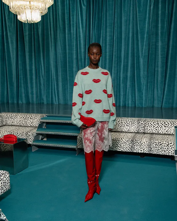 Angelic features surface as prints and embroideries, hovering lightly across garments. Graphic lips draw surreal exchanges that traverse fabric. The color palette reinforces this sense of vivid recall: bold reds, mint greens, pale pinks, and salt-and-pepper grey define the range. A pervasive dalmatian print punctuates the collection.