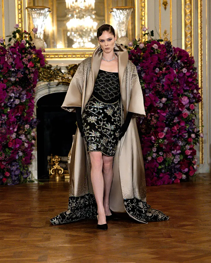 Draped silk taffeta wraps the body with a sense of rhythm, shifting and falling as if animated by breath. The material never appears static. It reacts, gathers, and releases, carrying feeling through weight and movement. Throughout the collection, motifs inspired by bamboo gardens and cherry blossoms appear to grow outward from the body. These elements are handcrafted using feathers and layered brass, creating forms that sit between botanical reference and couture construction. Sixteen looks make up the collection, adorned with more than 37,000 hand-embroidered Swarovski crystals. Select pieces required up to 2,500 hours of embroidery.