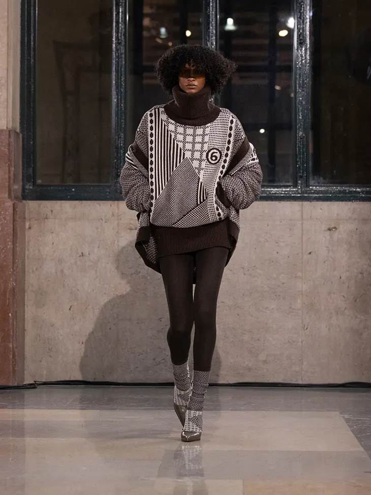 The wardrobe drew from widely recognized clothing categories. Checked shirts, denim jackets, blazers, full skirts, tracksuit tops, ski jumpers, zip-up fleece pieces, long-johns, boots, and pumps formed the core vocabulary. MM6 Maison Margiela arranged these garments in ways that challenged their expected use. A checker shirt paired with culottes or a full skirt disrupted conventional associations. A blazer worn over long-johns reframed underwear as visible clothing. A jumper appeared alone with tights, removing layering and exposing the garment’s silhouette and proportion.