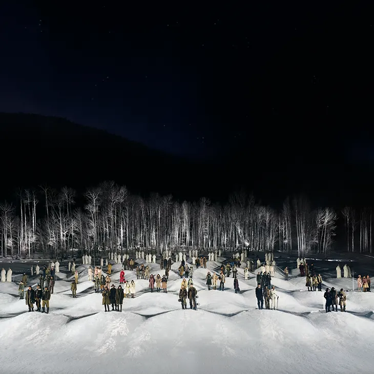 The 60-plus model lineup did incorporate geographic breadth, with faces spanning from Huijia Chen and Lina Zhang to Heather Diamond Strongarm and Ajah Angau Jok. But the sheer volume of the cast mirrored the collection’s own excess. When you need this many bodies to fill a runway, the individual impact of each look diminishes. Diane Kendal’s makeup kept things appropriately minimal, skin glowing against the snow, allowing the clothes to register in the challenging nighttime conditions. The casting served the spectacle. Whether it served the clothes is another question.