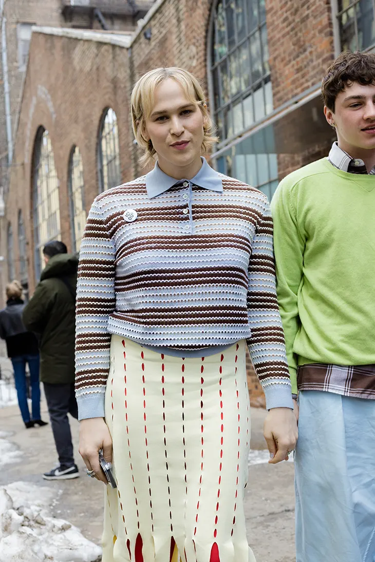 At Zankov, the mood shifted toward bold color and knit-focused silhouettes. Guests approached with a relaxed pace, often stopping to greet colleagues and collaborators along the barricades. The conversations, quick embraces, and spontaneous poses created a rhythm unique to the location. Didem’s lens followed the natural flow of arrivals, documenting the evolving mix of familiar industry faces and new personalities entering the frame.