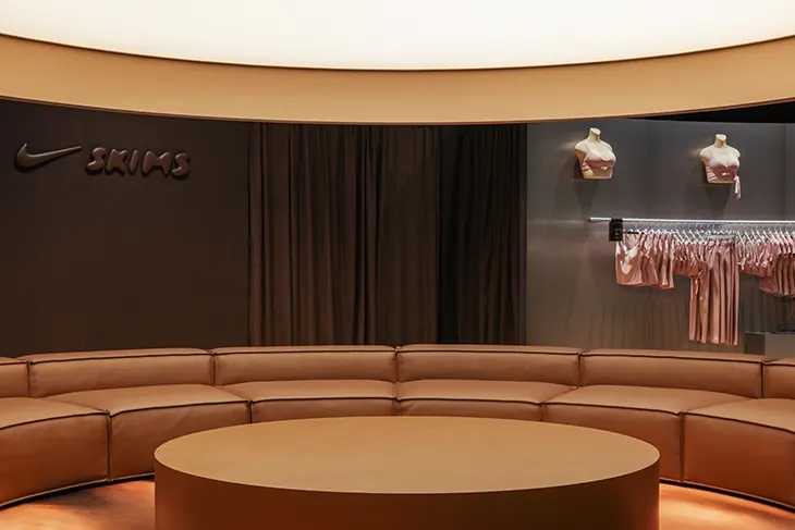 The circular pop-up was conceived by Harry Nuriev of Crosby Studios, and the design immediately signals SKIMS codes. Bathed entirely in the brand’s signature warm chocolate brown, the interior leans into organic curves, dark walls, and low ceilings, with a deliberate absence of natural light. The result is an enclosed, immersive atmosphere that keeps attention on form, texture, and silhouette. Despite its short lifespan, the space reads as a considered extension of the SKIMS visual language rather than a quick activation.