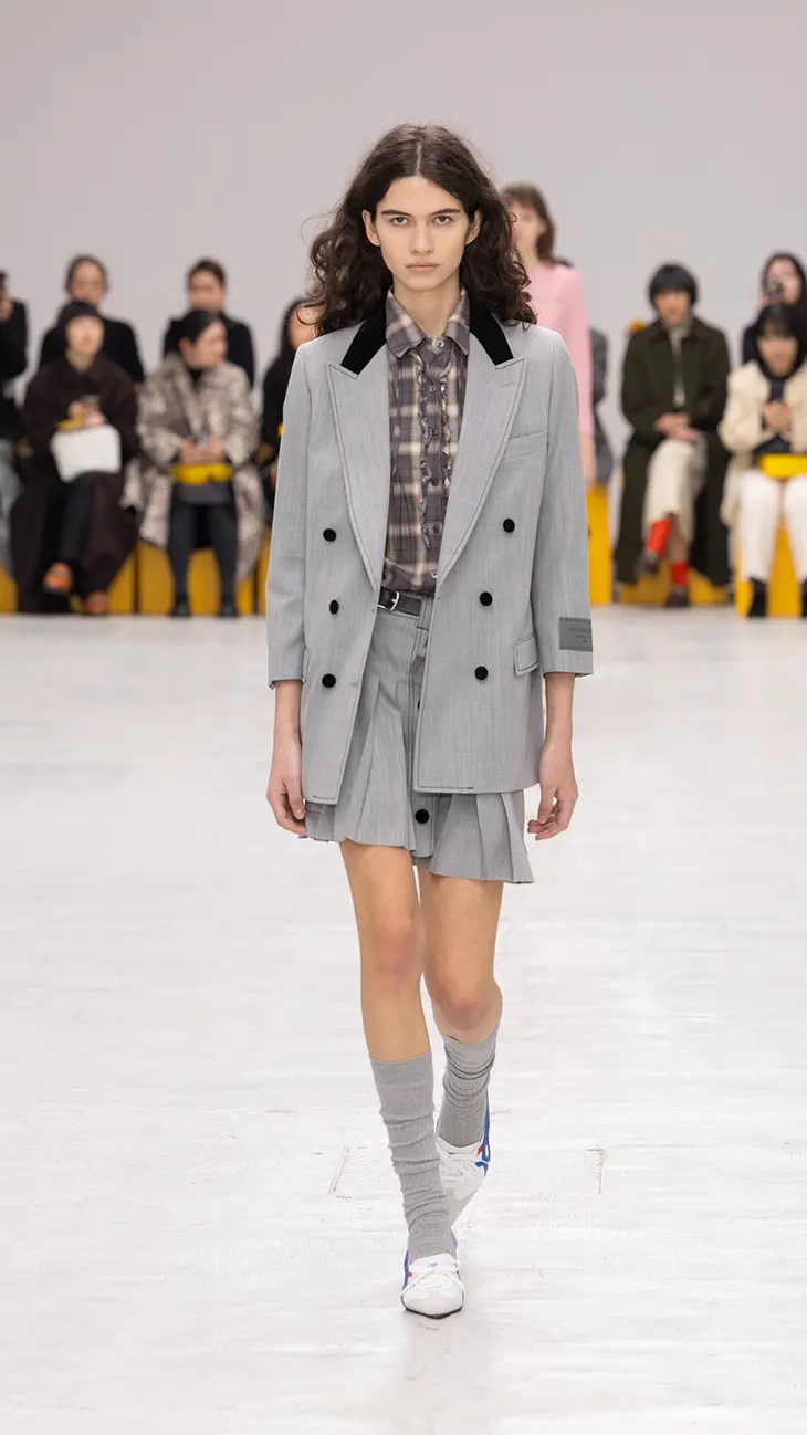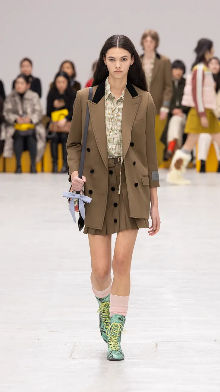 A long military-inspired double-breasted coat featured a defined collar and contrast buttons, styled with high-top sneakers that grounded the silhouette. A coordinated olive-green set combined a double-breasted blazer with a short pleated skirt, worn over a floral checked shirt with ruffled detail.