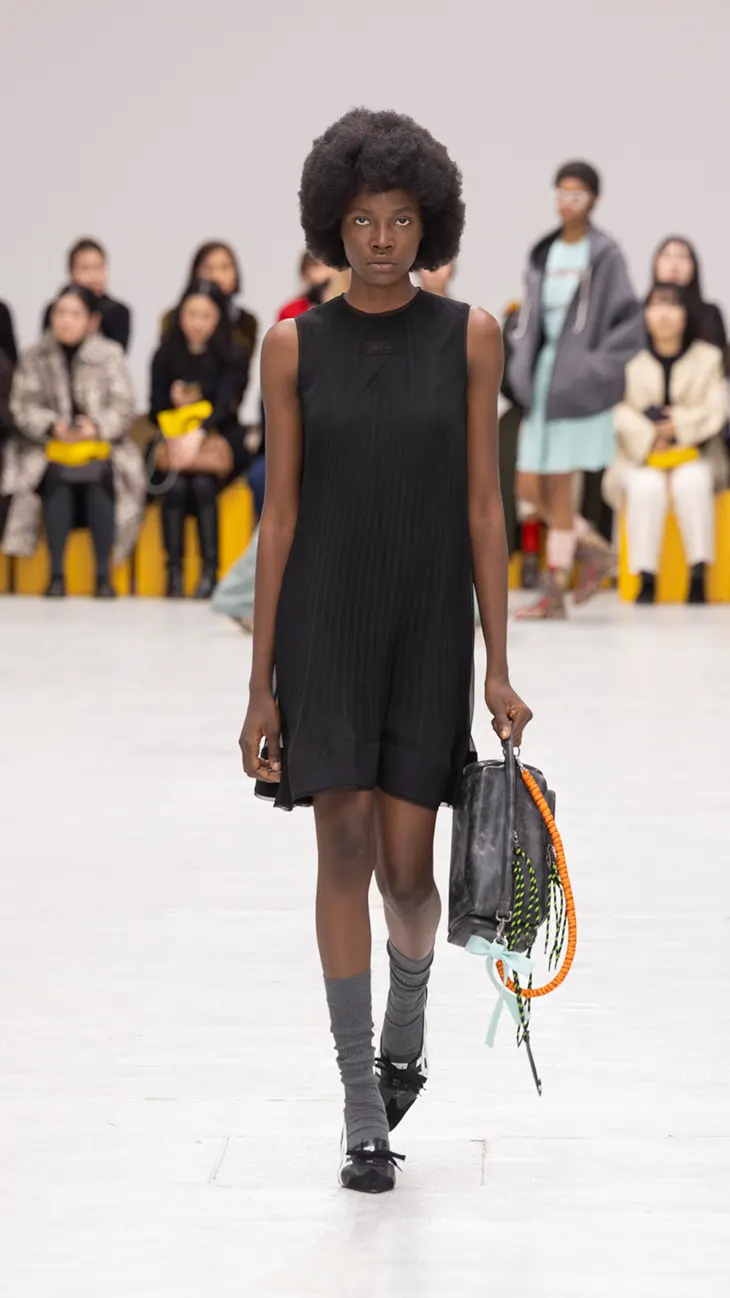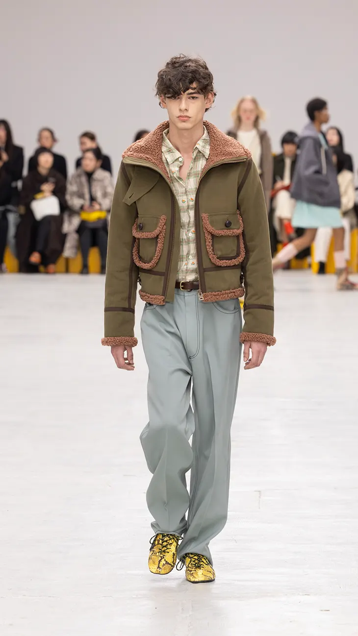 The runway introduced combinations that drew from multiple wardrobes. Formalwear, casualwear, workwear, and sportswear appeared together in layered compositions. A dress marked by horizontal bands paired with an oversized herringbone hoodie, creating contrast through proportion and texture. An apple-green pleated dress appeared beneath a compact corduroy vest bonded with boa and fitted with oversized pockets.
