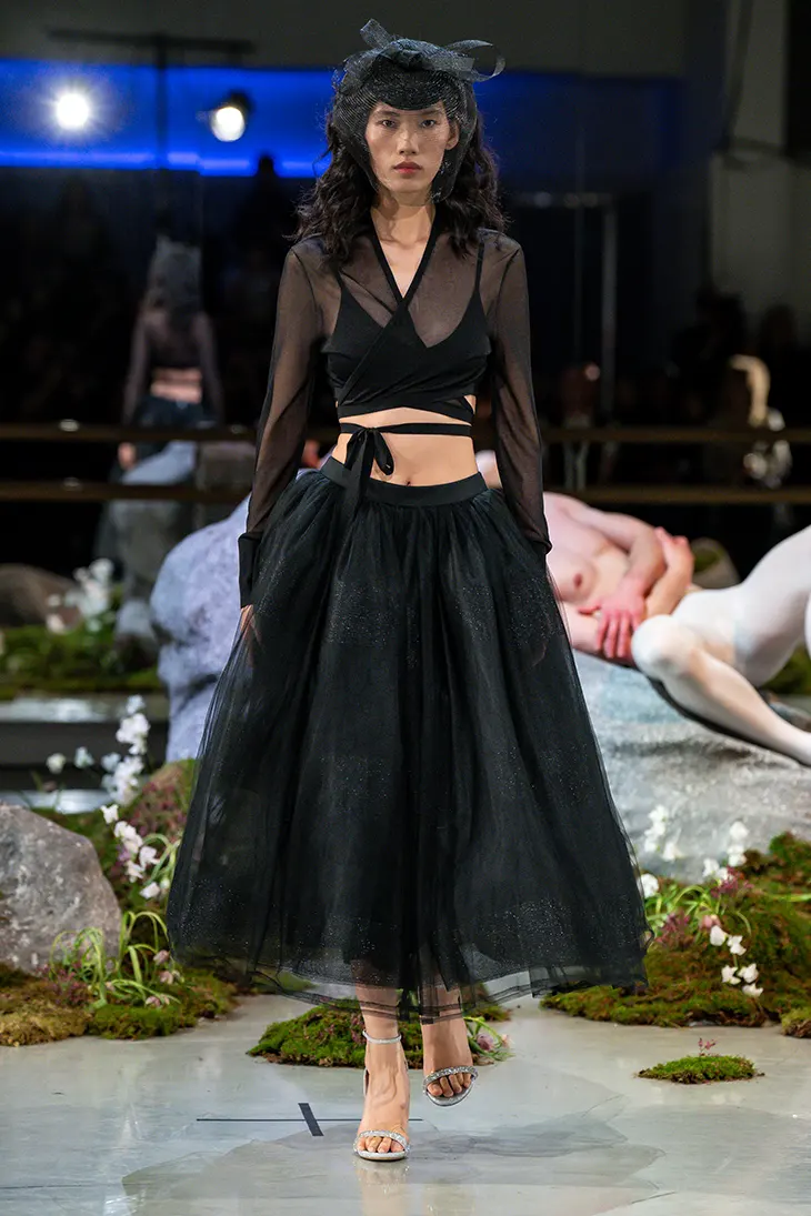 Danilo Giangreco, Artistic Ambassador for Revlon Professional UK and Ireland, styled hair for the show, with Revlon Professional shaping the overall aesthetic. MAC Cosmetic supported makeup under Key Artist Carly Utting. Blooming Haus transformed the performance space with floral installations. Casadei and Sebago supplied shoes, and Rouvenat provided jewellery. TIAGI Production managed show production. Harry Price directed movement, drawing on classical ballet and contemporary dance to shape expressive performance on the runway.