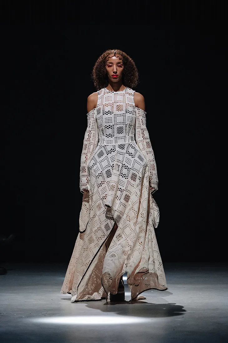 The silhouettes are characterised by a contemporary, minimalist, avant-garde overall impression. Contrary influences are often combined here: for example, sculptural garments are shown with flowing draping, and solid materials are set in motion. This creates many exciting, often unexpected overall looks. The outfits constantly play with volume, which is both constructed and dissolved. Another eye-catching feature are organic appliqués, which create a unique three-dimensionality and leave visible visual traces. It is important to mention that the silhouettes are not fixed in advance, but rather take shape and move in dialogue with the body.