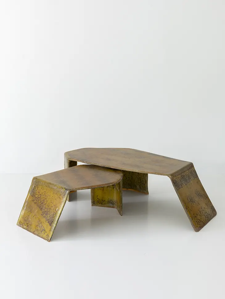 The Codex tables feature hand painted cryptic inscriptions. Do these marks carry meaning? – They are not meant to be read literally, though interestingly they often end up forming my initials. An accidental monogram. I think of them instead as fragments of a lost alphabet, traces of a language whose meaning has eroded over time.