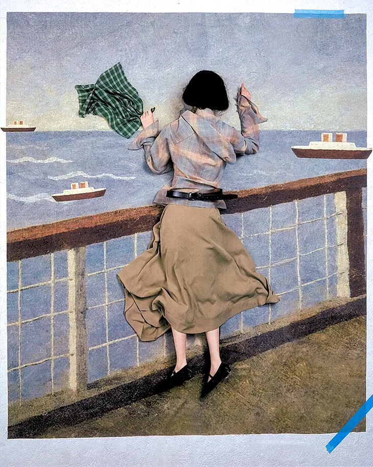 Makó shapes the campaign with an aesthetic informed by both fashion and fine art. He constructs a two-dimensional architectural mise-en-scène that emphasizes line and proportion. He compresses spatial depth with intention, directing attention toward silhouette and contour. This flattened perspective intensifies the sculptural quality of the subject and heightens the tension within the frame.