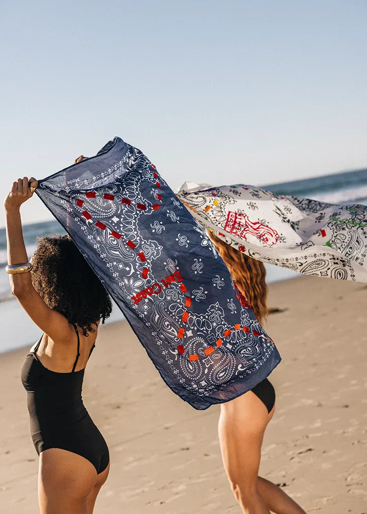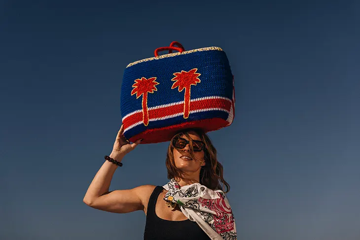 Kilometre Paris contributes its signature hand-embroidered storytelling to the project. The capsule introduces three silhouettes designed for travel. Handwoven basket bags range from the Undercover Basket to the sculptural Le Tube Basket. Artisans in Morocco craft these forms from natural date palm leaves and finish them with embroidery inspired by each resort. The process draws on regional techniques and established methods, aligning function with narrative detail. The collection also includes a hand-spun cotton bandana embroidered with references to coastal life.