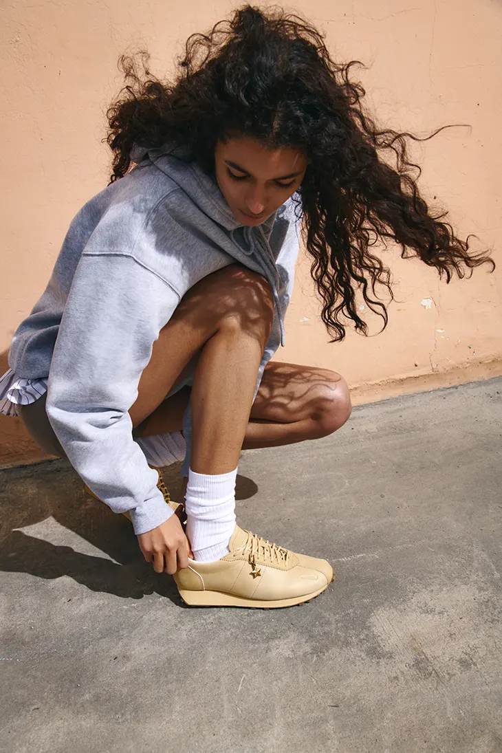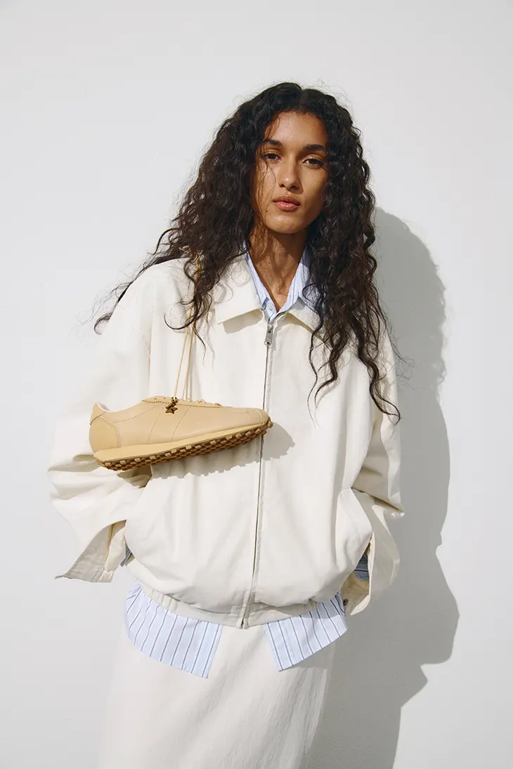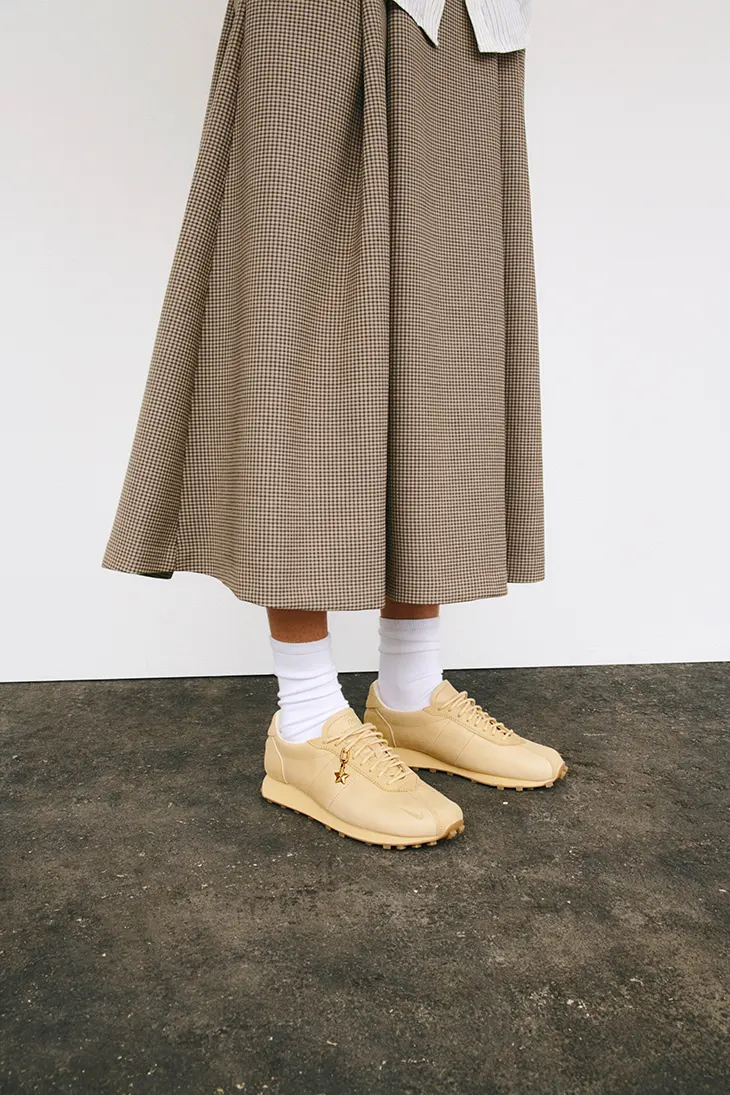 The Nike LD-1000 carries a history rooted in performance running, defined by its low profile and streamlined construction. Aritzia approaches the silhouette through material refinement, replacing traditional athletic finishes with premium tumbled leather. This leather introduces visible grain and depth, allowing each pair to evolve through wear. Over time, the surface develops individual variation, reinforcing the connection between the object and its wearer. The Sesame tone amplifies this effect, presenting a warm neutral palette that emphasizes texture and contour.