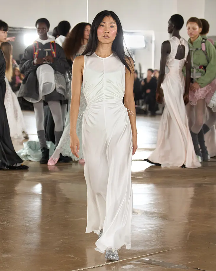 An elongated bias-cut silk satin dress drifts through the space as the wearer dances. Knits wrap across the shoulder and introduce a sense of intimacy within the layers. Pastel tones appear in layered combinations with transparent dresses grounded by fleece. Clean lines follow the body before opening at the hem.