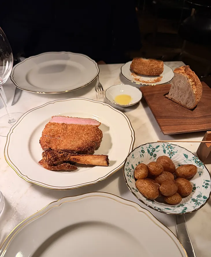 In my version, I first steam the veal to ensure it remains juicy, tender, and evenly cooked. Then I lightly brush it with butter, coat it in egg white and panko, and quickly deep-fry it in vegetable oil. This creates a crisp crust while keeping the interior succulent. In the traditional preparation, frying directly in butter often makes the meat heavy or unevenly cooked. My method is lighter and precise, but always preserves the “soul” of the cotoletta.