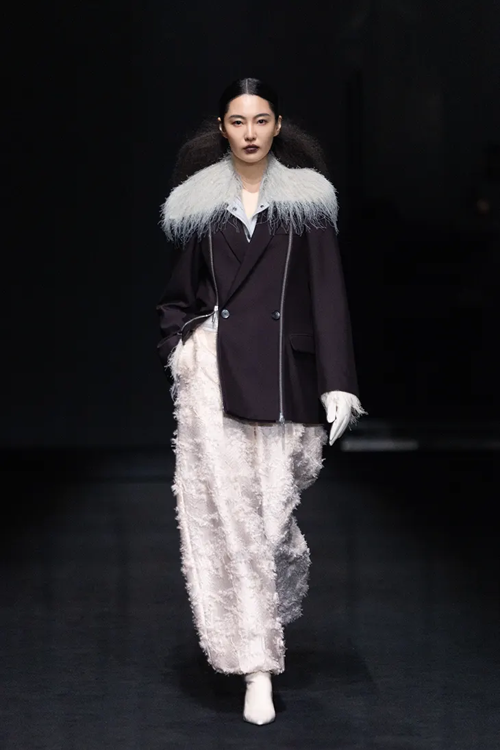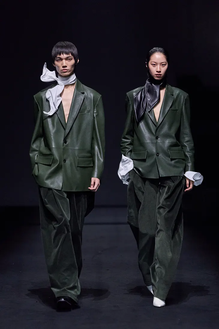 The womenswear line grows directly from the brand’s established menswear language. Wang builds on her approach to deconstruction and fabric development, adapting these elements to a new context. The collection develops through continuity, drawing from the same foundation while opening space for new forms and interpretations. The runway emphasizes this connection through styling. Models appear in pairs, wearing garments that reflect each other and extend the “Two Forces” framework. This visual structure reinforces the brand’s long-standing genderless approach while placing menswear and womenswear within a shared system.