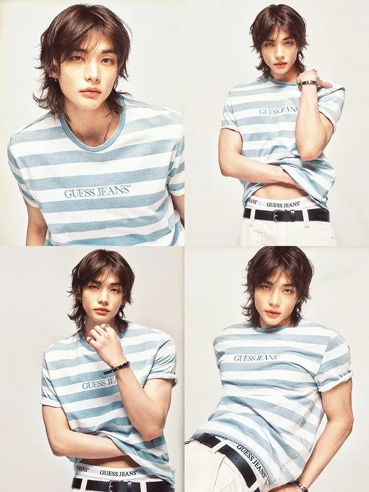 The partnership begins with Hyunjin’s first worldwide campaign for Guess. Built around the concept of “Modern Heritage,” the campaign revisits classic American denim staples through a contemporary styling approach. Straight-fit jeans, denim shirts, striped tees, and cargo silhouettes anchor the visuals, reinforcing the brand’s long-standing connection with.