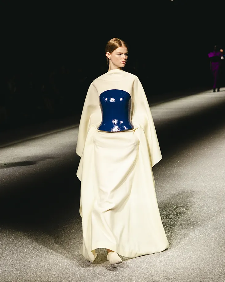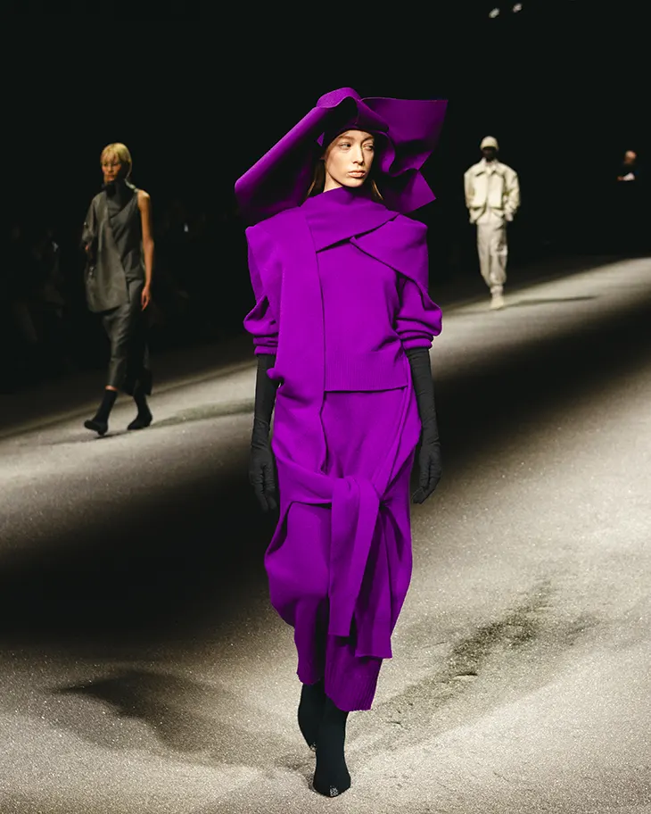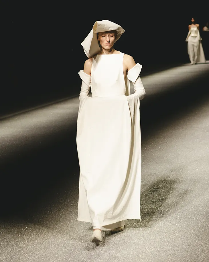 Headpieces constructed from fabric wrapped tightly around the head appeared throughout the presentation. The styling reduced visual distraction and directed attention toward silhouette and construction. The palette remained restrained through the first half of the show, relying largely on black, white, and neutral tones.
