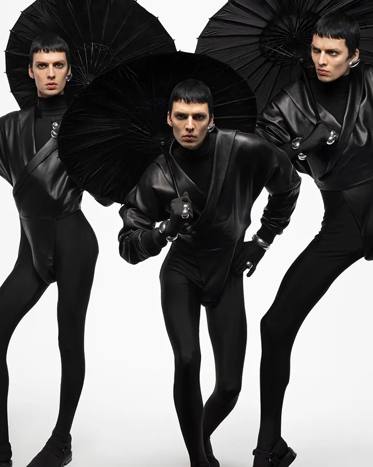 Photographers Inez and Vinoodh frame the series with a focus on silhouette and presence. Styling by Jodie Barnes reinforces this approach, placing the garments in direct conversation with the body. Leon Dame leads the cast, joined by Signe Michaelsson, Emaan Zishan, and Marte Mei Van Haaster, each contributing a distinct energy to the campaign’s structure.