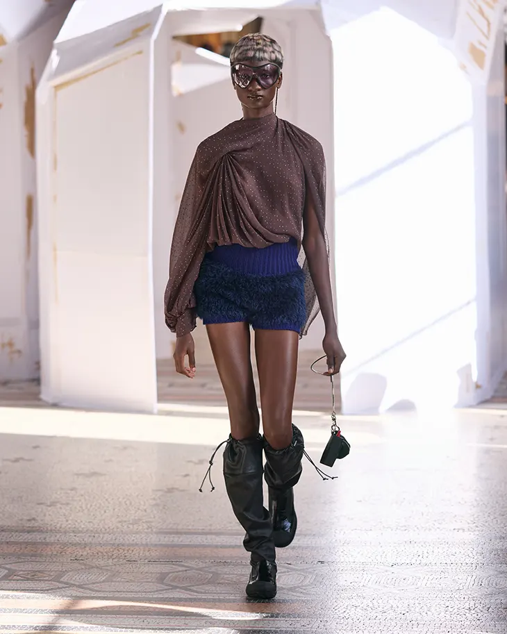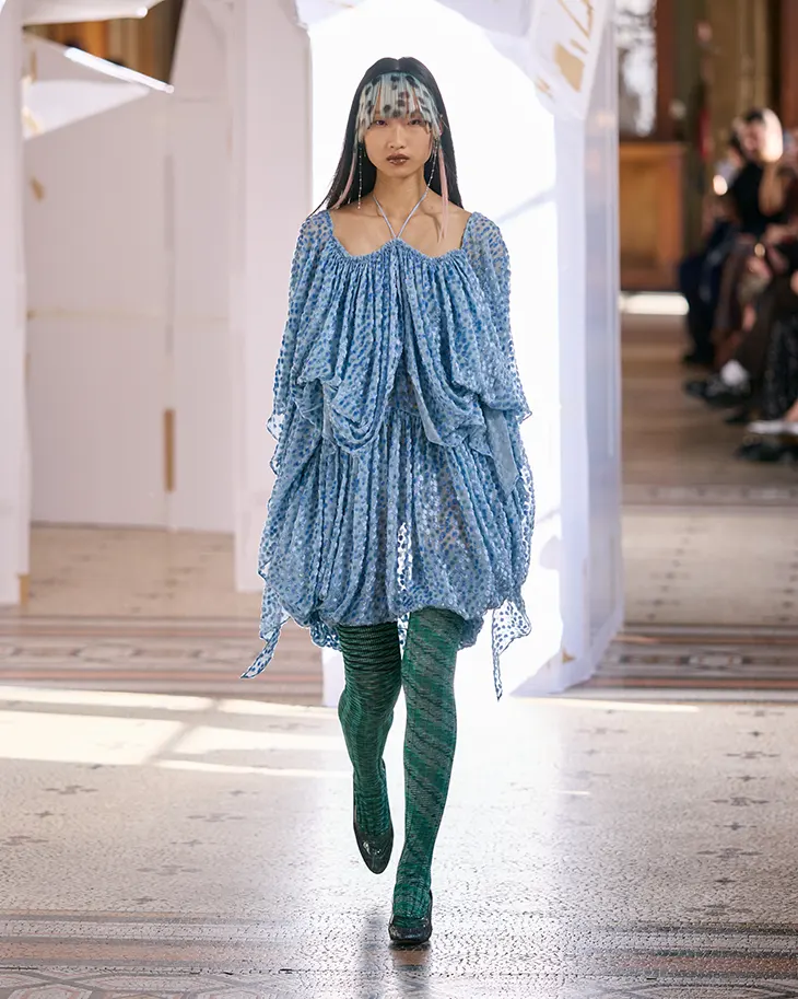 Kiko Kostadinov Fall Winter 2026 examines the relationship between observer and observed. The collection begins with a simple act of looking outward. Urban life offers small reminders of the natural world through birds that appear among buildings and streets. A heron, swan, or parakeet may cross the skyline of cities such as Paris, London, Tokyo, or Los Angeles. These encounters introduce a rhythm that connects everyday experience with the cadence of nature. The collection considers how observation shapes identity and perception, placing this exchange within the context of womanhood.