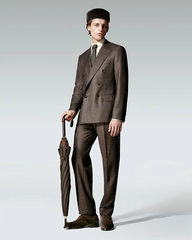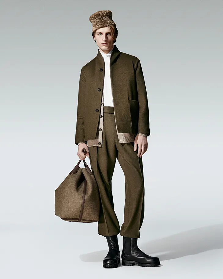 In menswear, fluid construction defines the silhouette. Cashmere, Baby Cashmere, The Gift of Kings, Pecora Nera, Merino, and tweed drive the tactile experience. The palette follows a measured path from ochre and terracotta to beige, grey, deep brown, then green, anthracite, tundra, and midnight blue, ending in black and white. Blazers and coats appear single or double breasted with peak or shawl lapels. Tailored two-pieces project composed formality.