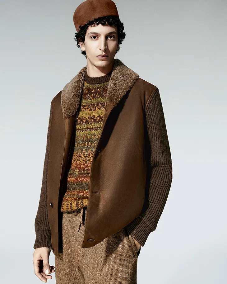 For women, silhouettes stretch and layer, grounded by flats and finished with abstract, exotic-leaning hats that sharpen the outline. Volume creates space between garment and body, allowing shapes to liquefy with gentle movement. Fabrics define the progression. Loro Piana Royal Lightness, cashmere, silk, Pecora Nera, Merino, tweed, mouliné, and chenille construct a tactile surface that evolves chromatically. The palette begins with ochre and terracotta, shifts through gold, rose, and brown, settles into beige, grey, and deep brown, then deepens into green, anthracite, tundra, and midnight blue. Coral, turquoise, sand, marigold, and azure punctuate the sequence before black, gold, and white conclude it.