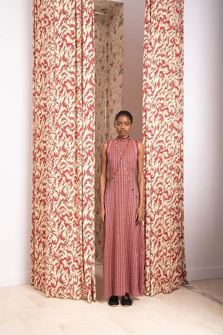 Maccapani presents the Fall Winter 2026 collection, See Throu, as a continuation of Margherita Missoni’s effort to define the brand through focused material and silhouette development. Missoni shifted her direction after the brand’s early seasons, when broader offerings created uncertainty around its identity. She reduced the collection to its essential elements and centered the design language on jersey jacquard, the material that formed the brand’s foundation. Early jacquards featured graphic surfaces with lurex threads, which later evolved into solid versions with a subtle moiré effect. Lighter constructions followed, introducing fluidity and movement across dresses designed for warmer seasons.