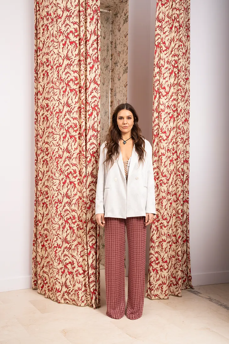 Material development guides the Fall Winter 2026 collection, introducing softer fabrics and expanded silhouettes shaped by the needs of those she dresses. This direction led to the development of wool-like jacquard shaped into overshirts and padded to create bomber jackets.