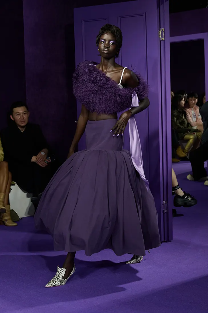 The runway environment extends this atmosphere. Purple velvet defines the space, forming an immersive setting that narrows focus and alters perception. The presentation shifts away from large-scale narrative staging and moves toward a sensory experience. The audience enters a controlled environment that reflects the internal state of the collection’s central figure.