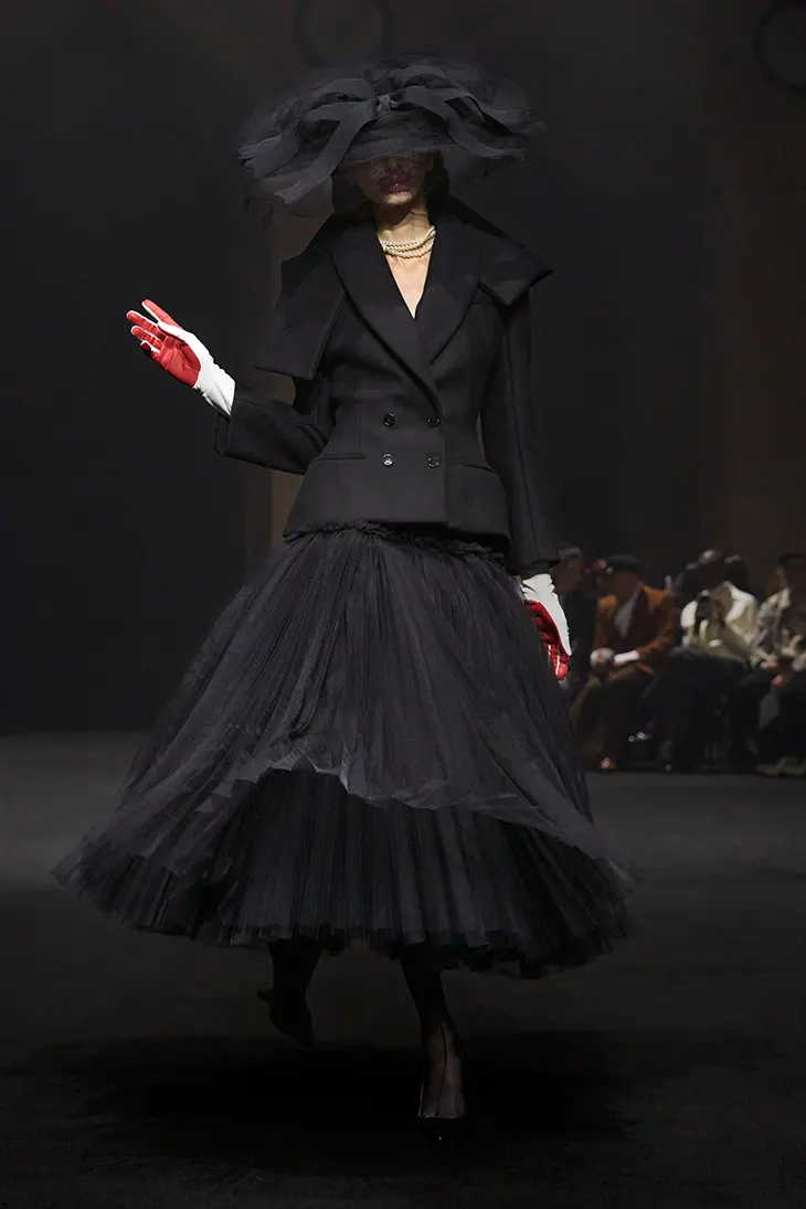 The opening tableau introduces the bourgeois family. This sequence interprets high-class attire through the designers’ distorted vision of glamour. The looks question ideals of beauty and expose emotional coldness linked with elitism. Dalton and Bhaskaran refer to their reinterpretation as a “Fecalized” New Look. White lamb leather couture opera gloves titled Guilt Gloves feature red palms and accompany new heels created with Louboutin. The gloves express vulnerability and fear associated with positions of influence. A billionaire figure appears in a severe cashmere shoulder cape defined by a cross symbol pocket opening. Mille-feuille skirts incorporate built-in hip extensions and elastic cutouts, expressing the label’s Prêt à Couture concept.