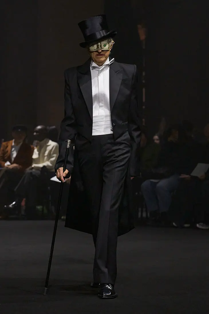 The collection studies luxury as both aspiration and exclusion. Access to wealth can empower individuals while also creating distance from those outside that circle. Matières Fécales organizes the runway into three tableaux that examine different dimensions of power. The first studies archetypes associated with elite identity. The second addresses community. The final sequence considers the future and the individuals who influence it.