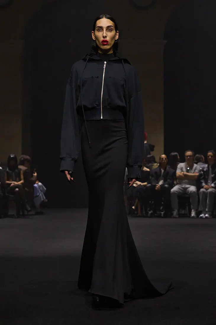 The second tableau examines the strength of community. Since their Paris debut last year, observers often describe Matières Fécales as a cult brand due to its devoted supporters. Dalton and Bhaskaran translate that relationship into clothing worn by friends and collaborators. Jersey hoodie capes with extended kangaroo pockets introduce silhouettes shaped by comfort and collective identity.