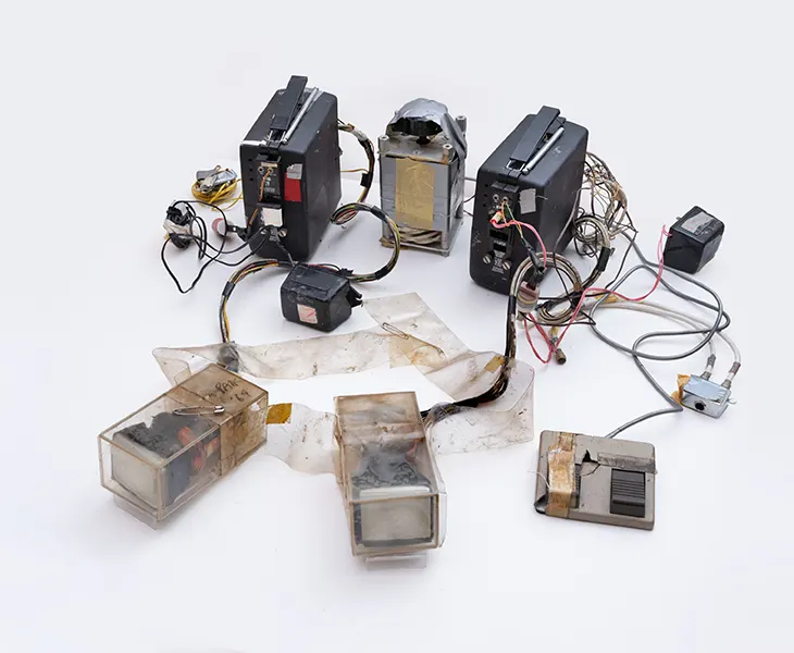 One of the central pieces in the exhibition is TV Bra for Living Sculpture (1969), a work originally created for musician and performance artist Charlotte Moorman. The piece consists of a clear vinyl garment that incorporates two small black-and-white televisions encased in plexiglass boxes. Moorman first performed wearing the piece during the opening of TV as a Creative Medium at the Howard Wise Gallery in New York in 1969. As she played the cello, the sounds of the instrument altered the images displayed on the television screens. Through this interaction, Paik sought to soften the mechanical presence of television and transform it into a responsive element within performance.