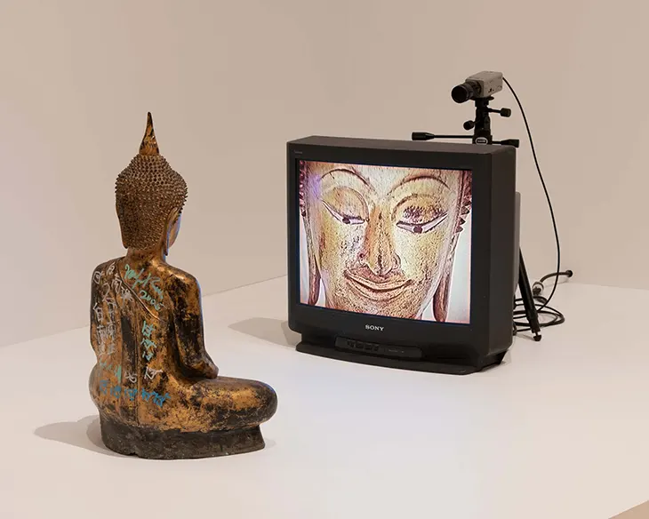 The exhibition also includes Gold TV Buddha (2005), part of Paik’s long-running TV Buddha series developed between 1974 and 2005. In this work a gilded bronze statue of Buddha sits before a video camera and monitor, observing its own image in real time. The piece creates a quiet dialogue between ancient spiritual traditions and contemporary media systems, placing introspection and technological mediation within the same visual circuit.