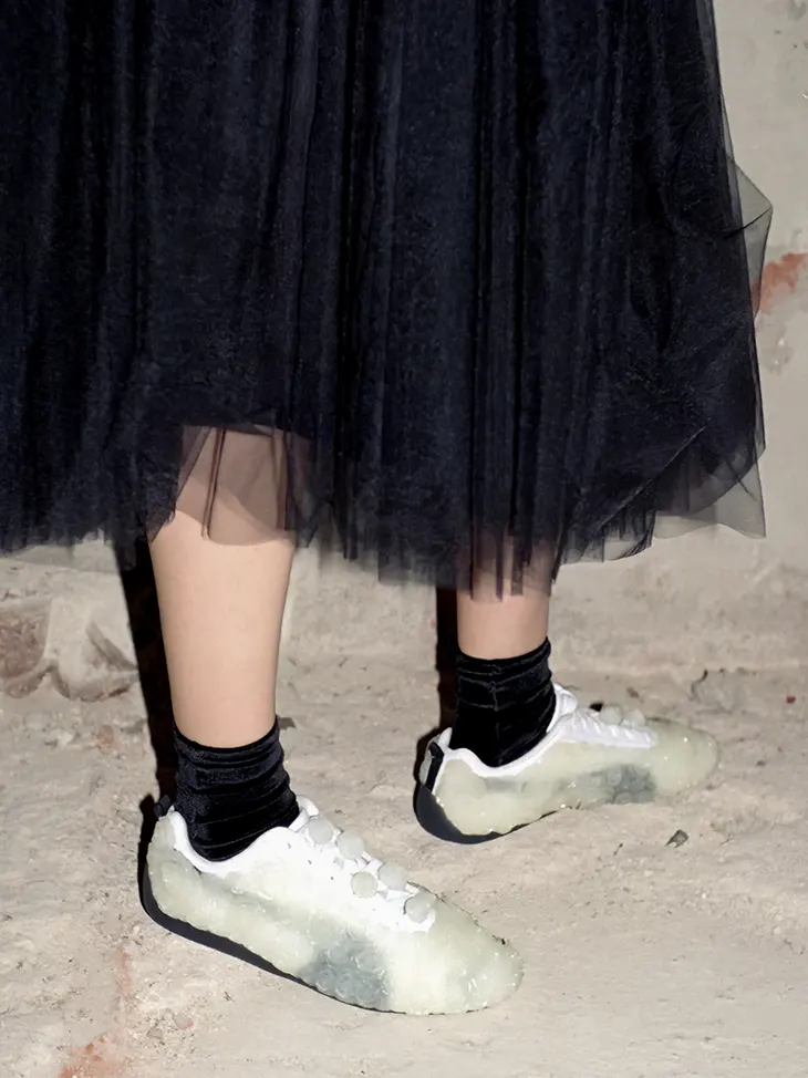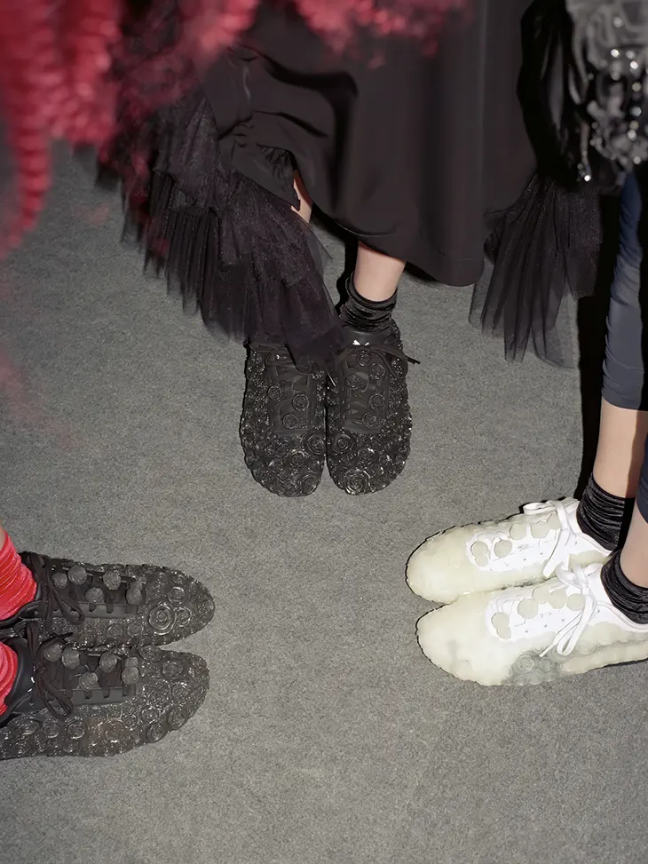 This approach reflects the design vocabulary that defines Noir Kei Ninomiya. Since launching the label in 2012 under the Comme des Garçons umbrella, Ninomiya has built a reputation for garments constructed through modular components and unusual fabrication techniques. His clothing often relies on linking small units together to create sculptural volumes. The sneakers echo this logic. Instead of treating the shoe as a smooth surface, Ninomiya builds a layered skin from repeated elements.