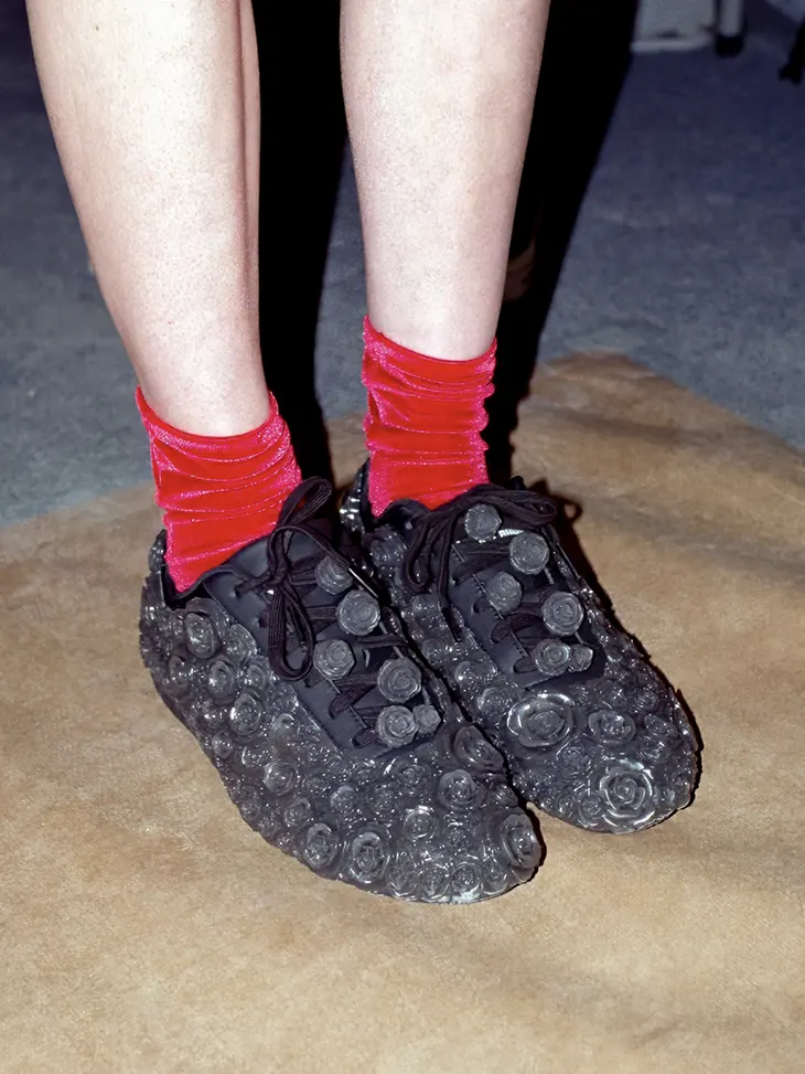 On the runway, the sneakers appeared beneath several of the show’s key looks. Models walked in them while wearing voluminous black garments constructed from complex modular assemblies, metallic cages, and exaggerated floral forms. Against these dramatic silhouettes, the footwear introduced a grounded element while still participating in the same visual language.