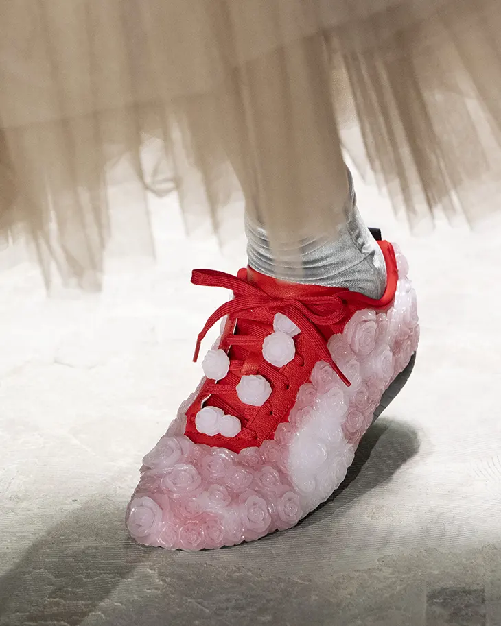 The Speedcat appears in several variations throughout the show, each defined by clusters of translucent three-dimensional flowers stitched across the shoe’s surface. These elements cover the suede upper like a soft armor of petals. In white and deep charcoal tones, the flowers create a tactile structure that transforms the sleek racing profile into something almost organic. The lacing system remains visible, threading through the floral clusters, which reinforces the contrast between the technical base and the decorative overlay.